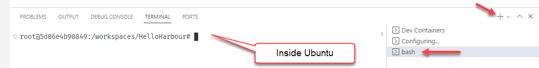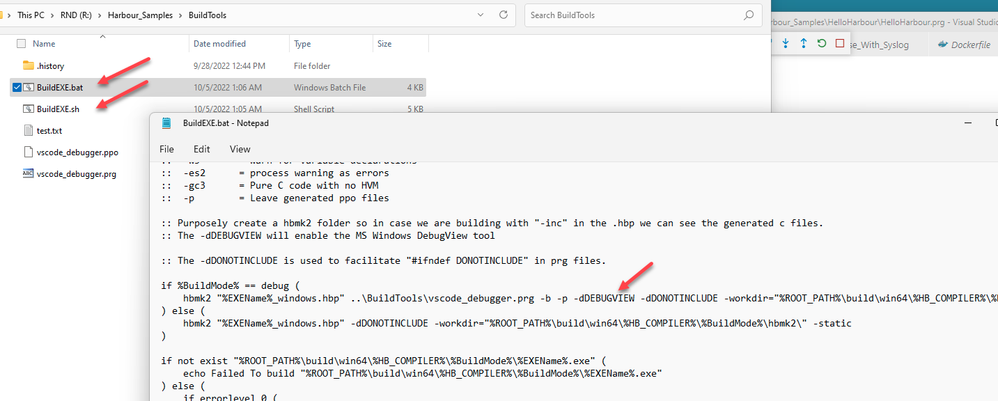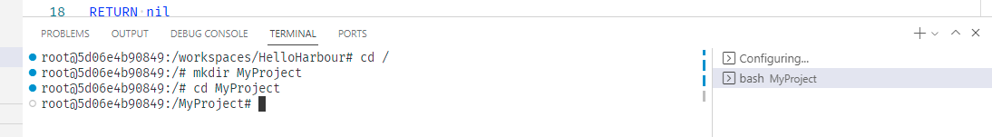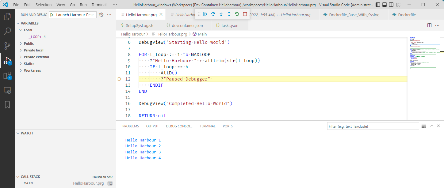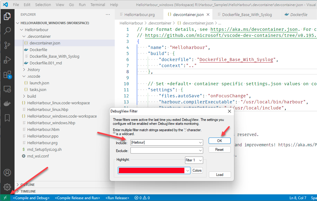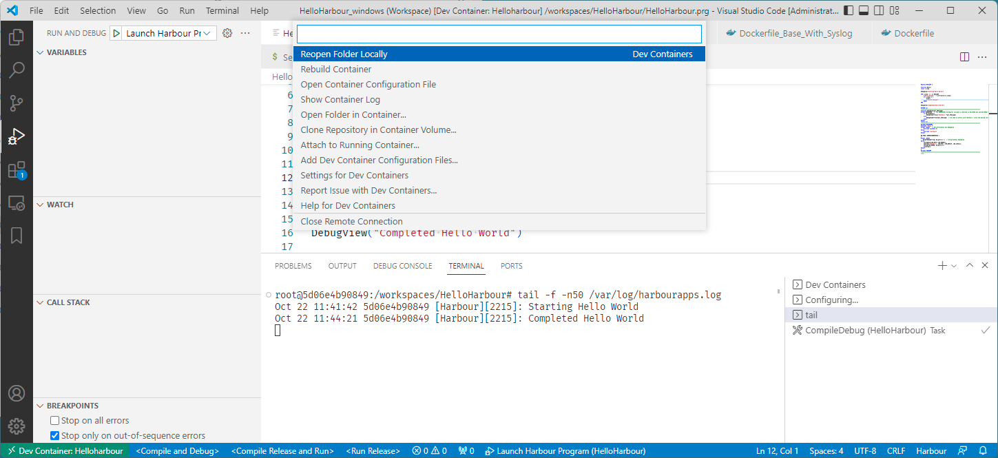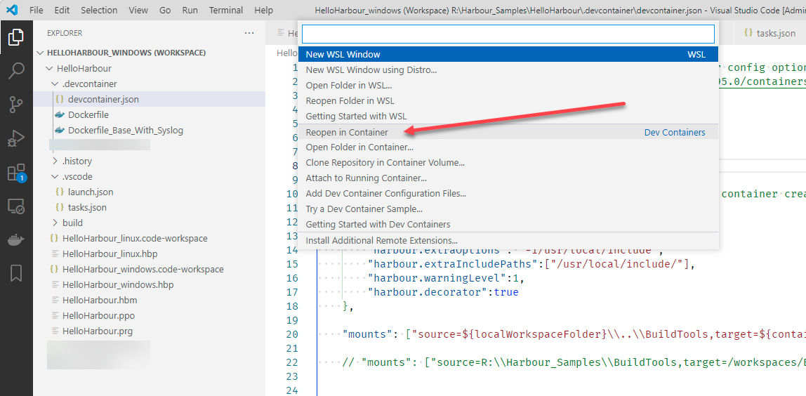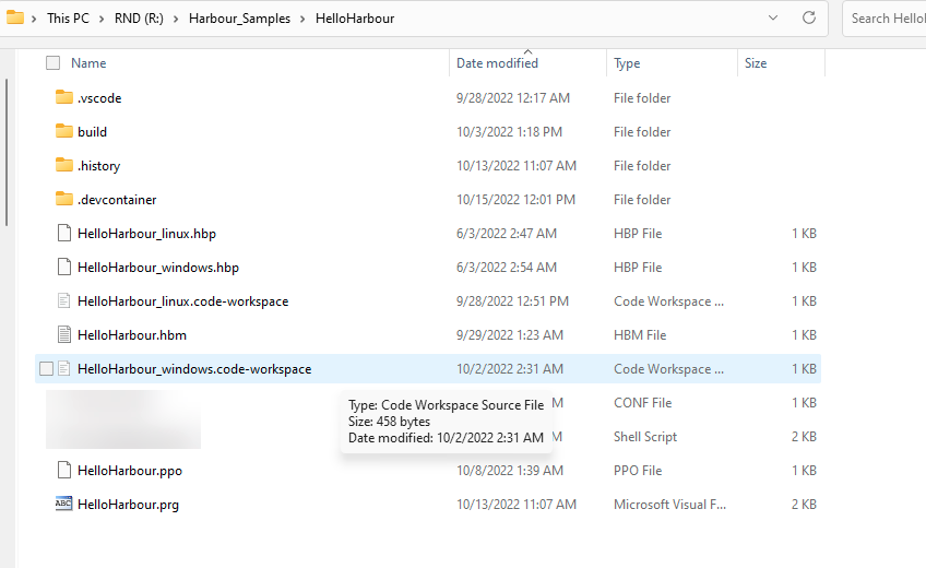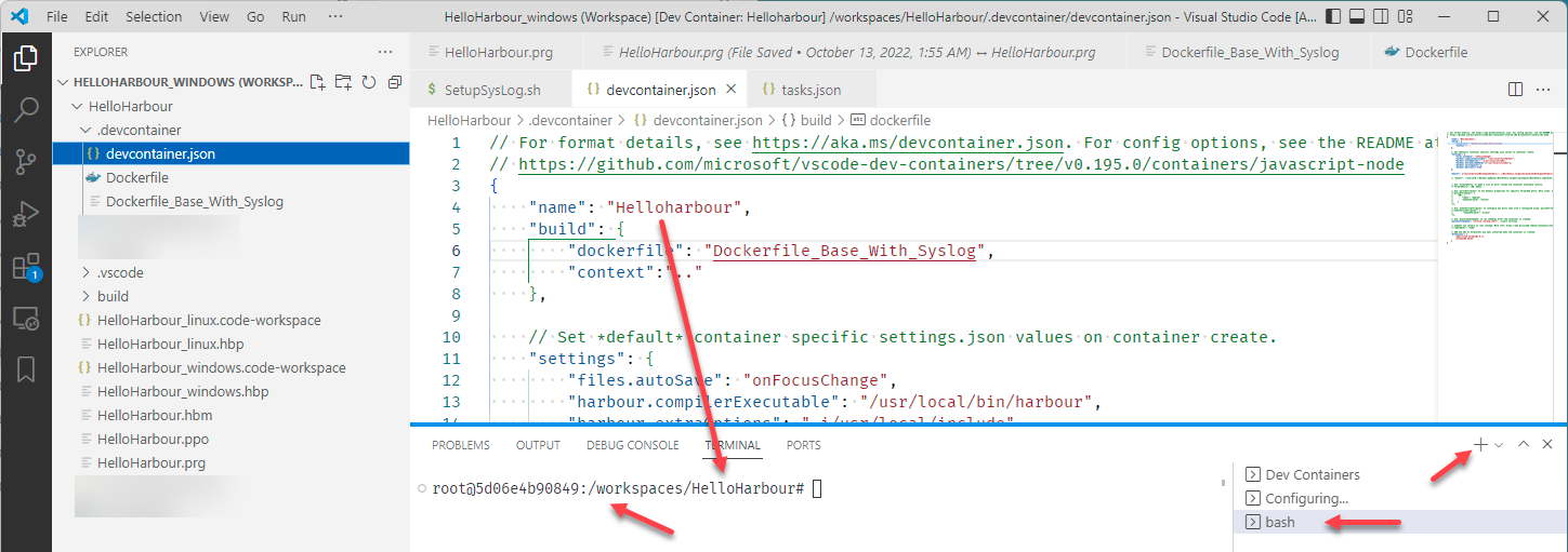 Additionally your source code does not even have to be copied into the Docker container. The folder from where you opened VSCode will be "mounted" inside the running docker "container" as a folder /workspaces/<"name" property inside devcontainer.json>/. So in the example below the R:\Harbour_Samples\HelloHarbour Windows folder will appear as /workspaces/HelloHarbour/