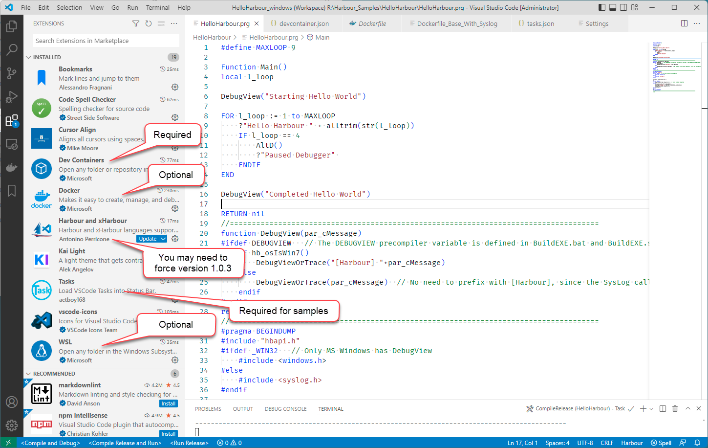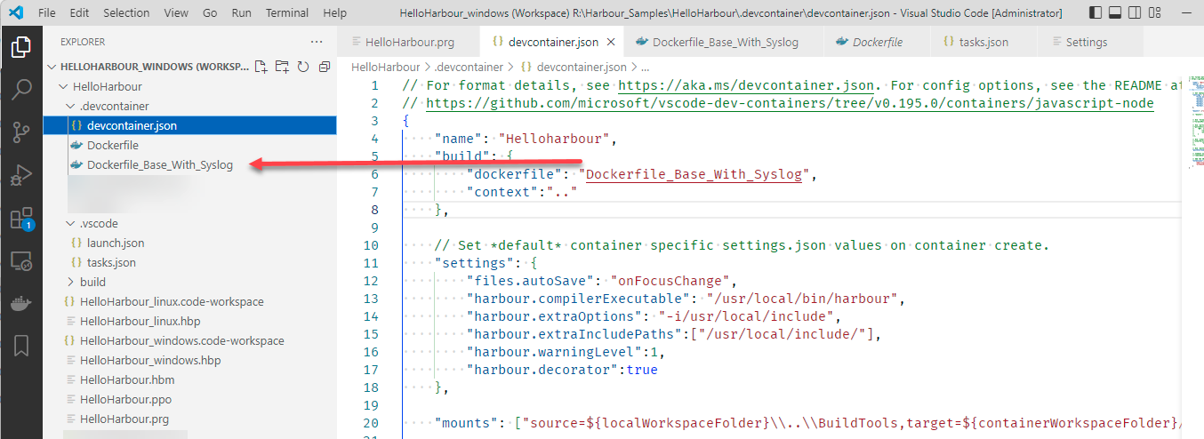 Line 11-17: The following are settings to be used while inside the container. The Harbour extension install locally had its path local to Windows, here we need to make them local ton inside the container.