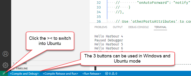 Line 20: It is possible to mount additional local folder to appear as it they are local to the container. In the Harbour_Samples, we placed all the build and debug tools in a parallel folder named "BuildTools".