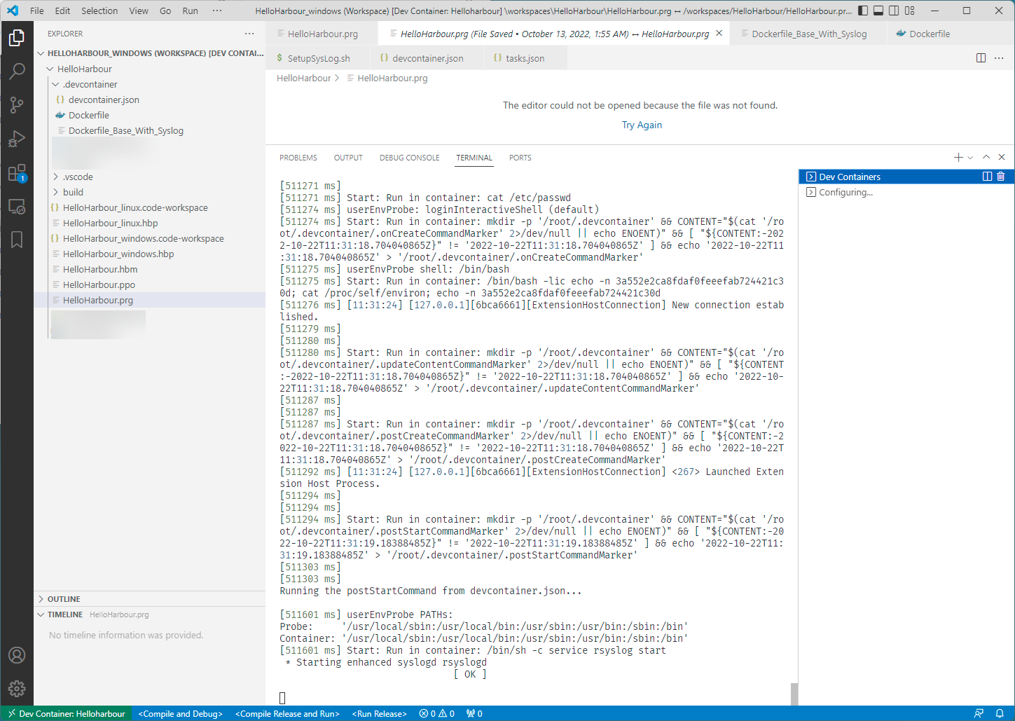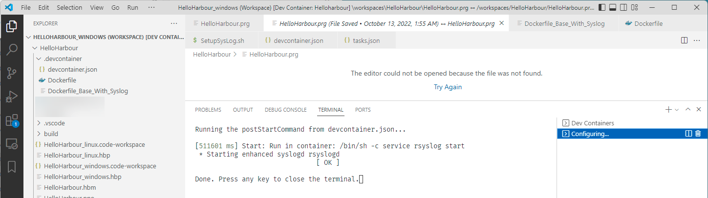 - "postStartCommand": In the HelloHarbour sample we wanted to use the Linux syslog as an equivalent to Microsoft Windows DebugView. To capture syslog messages and write them to a log file a service had to be started. "service rsyslog start". In Dev Containers there is no support for Dokerfile instructions CMD and ENTRYPOINT. But it is possible to execute one or many commands once the container is running, and before you can access it.
