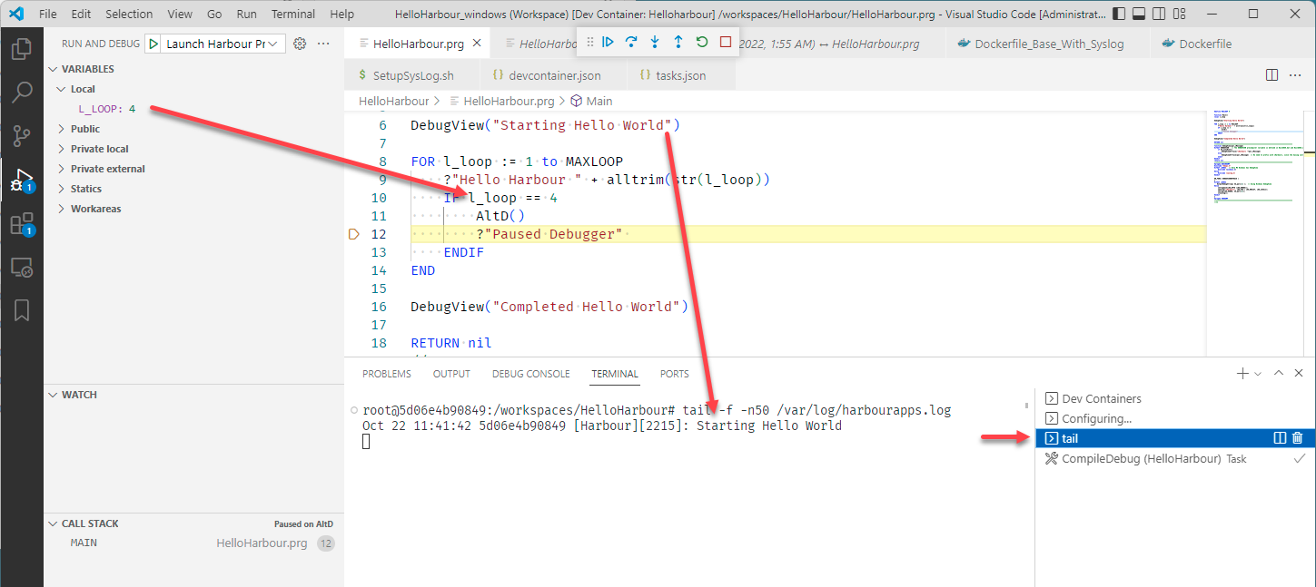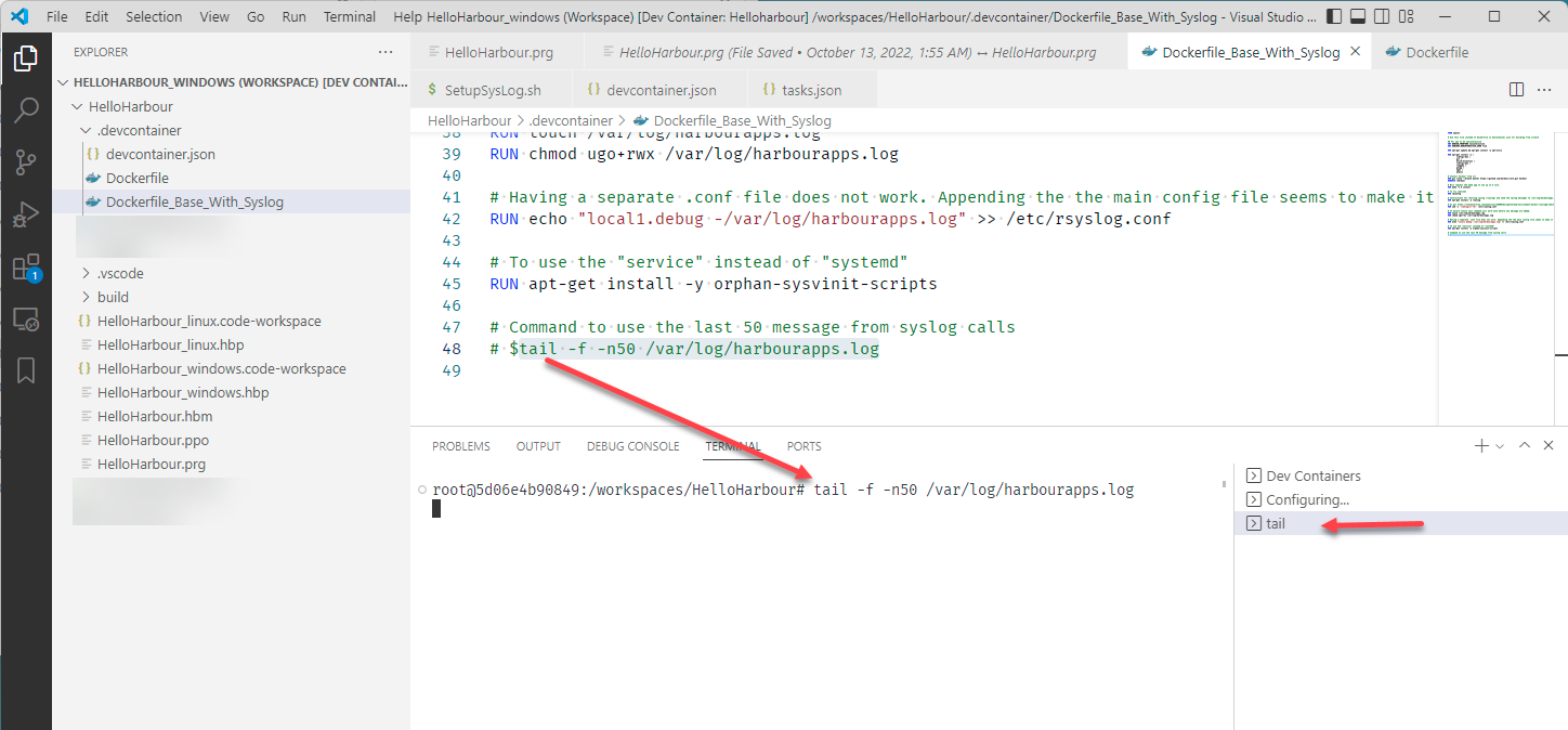 Review the Dockerfile (in .devcontainer folder) and HelloHarbour.prg (bottom area of file) to see what was needed for syslog to work.