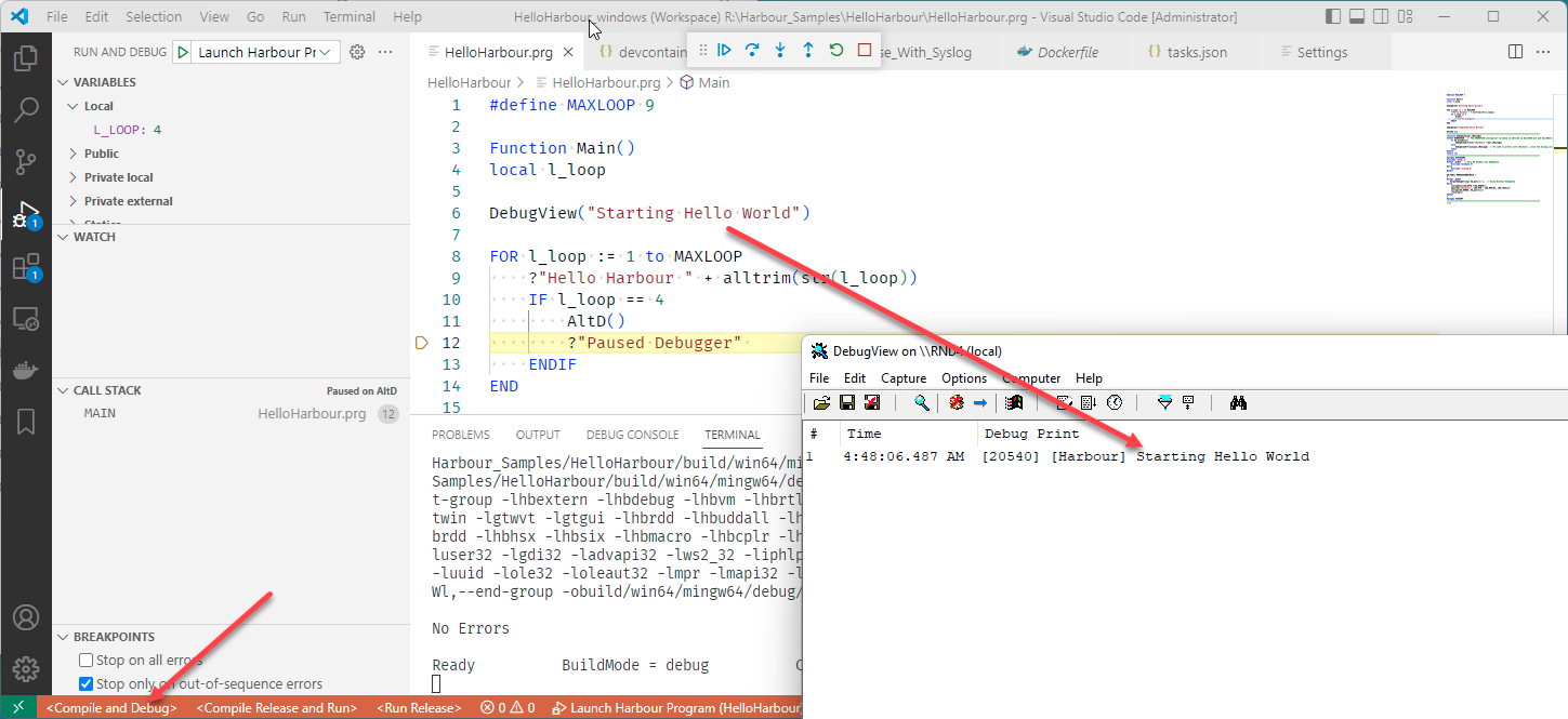 In the HelloHarbour sample, you can also view a "DebugView" like log. Use the "tail" linux command in a new bash terminal. The -n50 will specify to see the last 50 log entries.