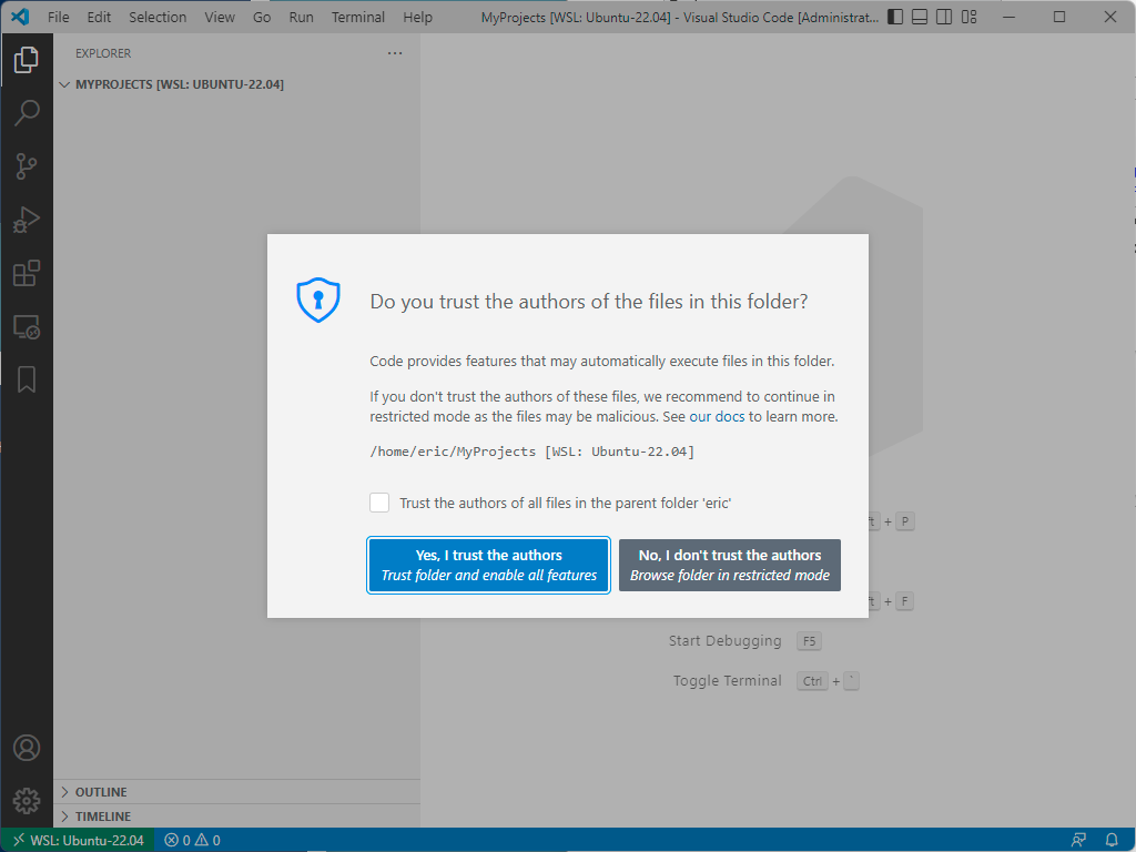 The idea of developing in Windows while running/debugging in Linux can be implemented by using VSCode from our host Windows and telling VSCode how to create/use Docker Containers.